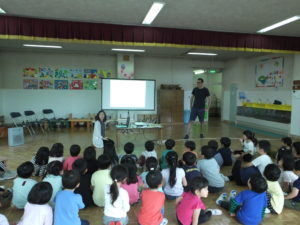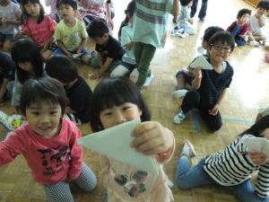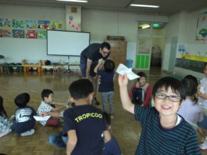 令和初めてのキッズ・レッツ・プレイは,くりやがわ保育園で賑やかに始まりました。今回の講師はキューバ出身のリカルド先生。背が高く,スペイン語を話す先生に園児のみんなは興味津々。プレゼンテーションではキューバが日本からどれくらい遠いのか,先生の地元の風景が日本とは違うこと,キューバの遊園地にある乗り物は日本から海を渡ってやってきた,など色々な情報や写真にみんな「えー?」や「おおー!」と大盛り上がり。キューバの様子や,「Hola (こんにちは)」「Gracias (ありがとう)」などの簡単なスペイン語を勉強した後は,先生に教わりながら,キューバの子供たちが作って遊ぶというボートを紙で折ってみんなで完成させました。最後に遊んだキューバのゲーム「Tierra Y Mar (陸と海)」はちょっぴり難しいルールでしたが,園児のみんなは次第にコツを掴んでいき,先生の指示通りちゃんと跳べている子も見受けられました。途中で負けた子も,長身の先生が抱っこをしてゲームの輪から連れ出してくれるので,嬉しそうな笑顔を見せていたのが印象的でした。楽しい時間も終わりに近づき,最後はリカルド先生に習ったばかりのスペイン語で「Gracias!」とお礼を言う園児や,ハイタッチをしたり抱き着いたりする園児もいて見ていてとても微笑ましかったです。くりやがわ保育園の園児のみんな,先生方,どうもありがとうございました。