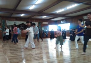 講座では剣道の成り立ちや,竹刀・防具の説明,それが終わると実践として面打ち,小手打ち,胴打ちや応じ技といった難しい動きにも挑戦してみました。面を着けた橋市道場の門下生さんたちを相手に実際に打ち方の練習も行い,最初は恐る恐る打ち込んでいた参加者も,数を重ねるにつれ緊張感の中にも楽しさを見つけたような,そんな表情で取り組んでいたのがとても印象的でしたよ。門下生の皆さんが参加者に歩み寄り,より良い打ち方を教えてあげている場面も見受けられ,言葉は通じなくてもスポーツや武道を通して交流をすることは可能だということを改め感じさせられました。剣道におけるとても大事な要素,足捌きの説明の後は,みんなで一緒に「摺り足リレー」を行いました。先生が教えてくれた「右足はいつも前,左足はいつも後ろ」を意識しつつ,楽しくリレーをしながら摺り足を練習しました。
