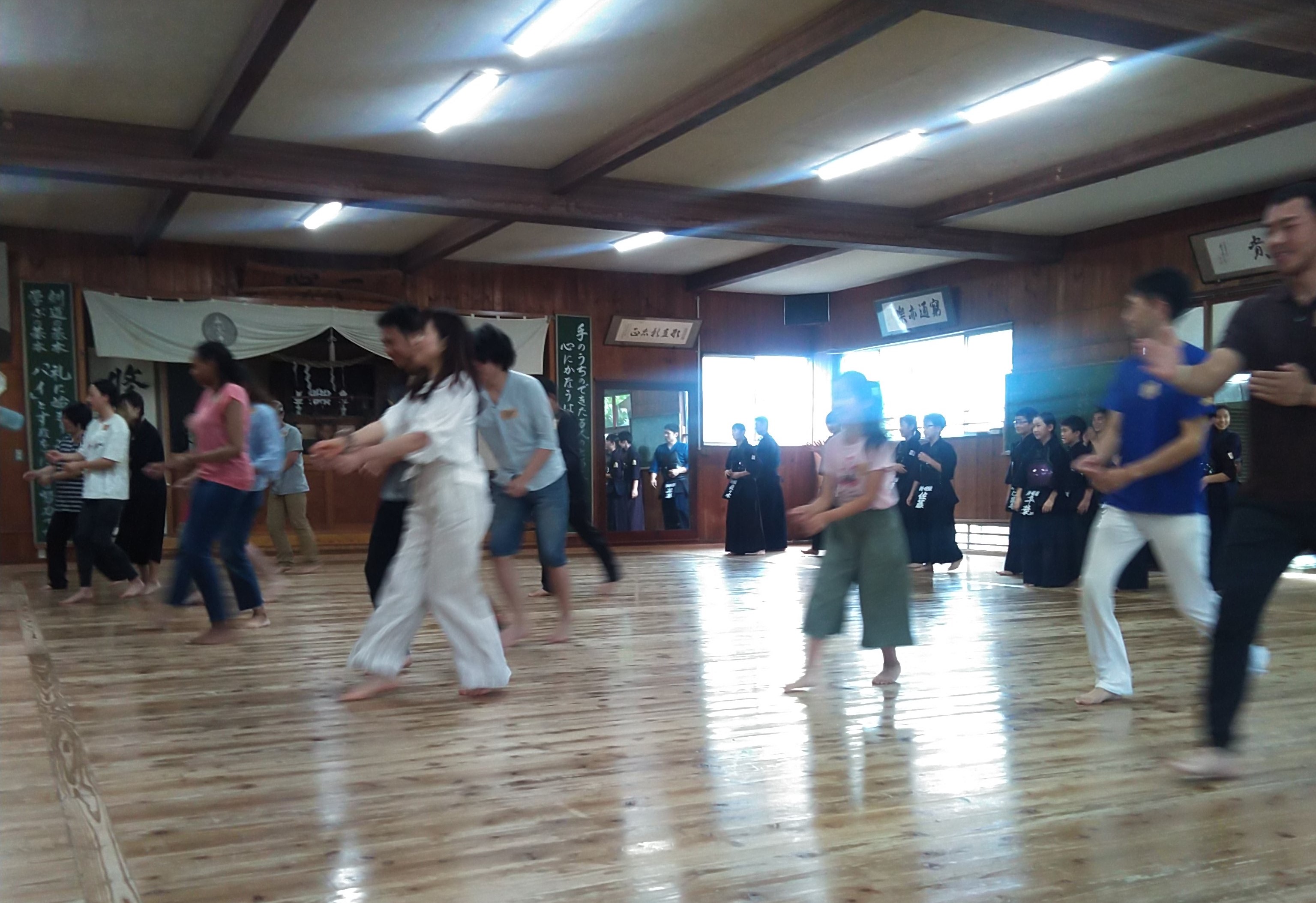最後に門下生の皆さんによる稽古のデモンストレーションを見学しました。これはもう「かっこいい!」の一言で,参加者の皆さんはじっとその様子を見つめていました。このレベルになるまでには,たくさんの努力を要したのだろうな,と思わせるような,ダイナミック且つ正確で,そして速い剣道の動きを楽しませていただきました。