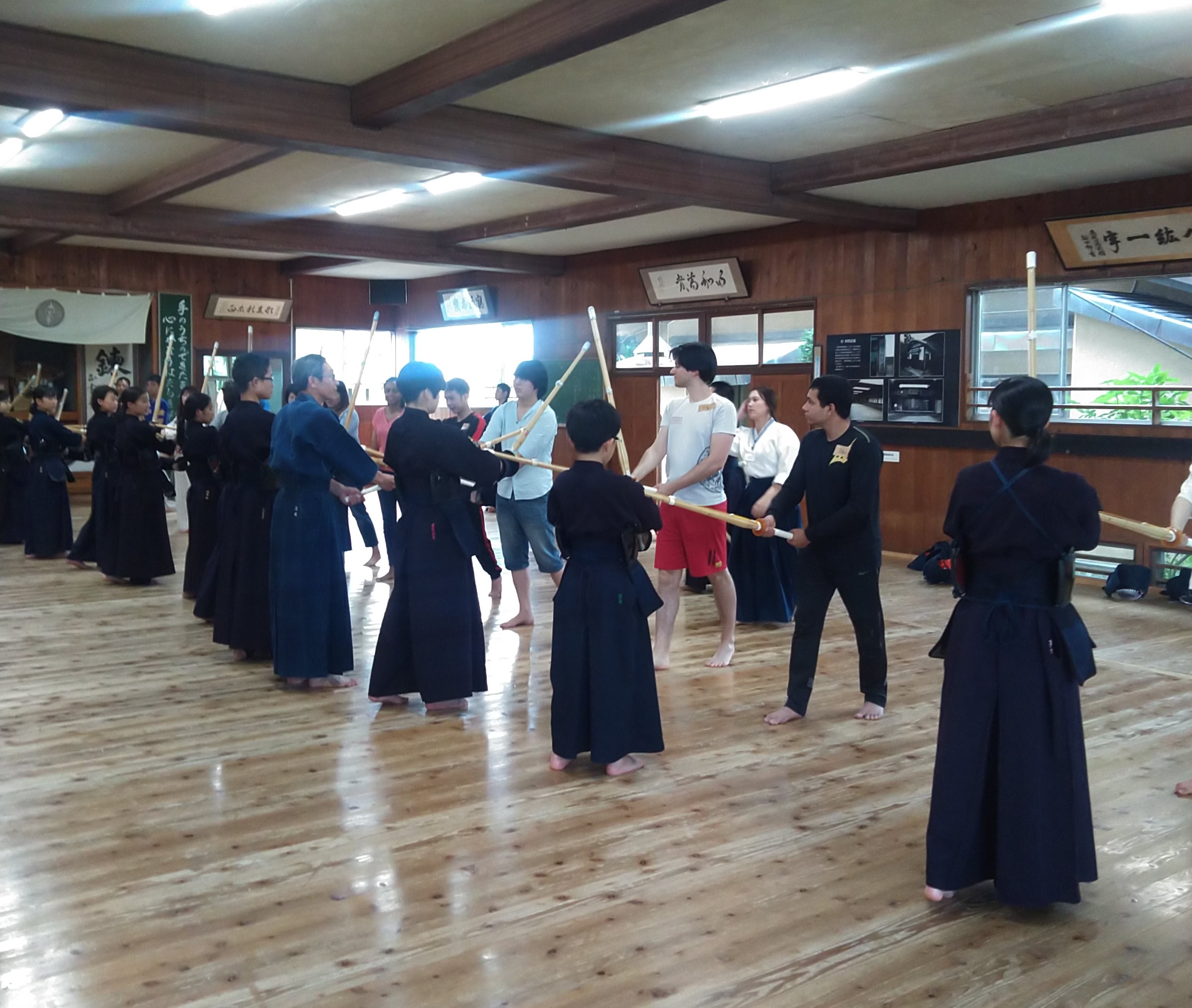 今回は中国,ベトナム,モンゴル,スイス,アメリカ,タイ,ケニア,バングラデシュ出身の外国籍市民を含むたくさんの方々にご参加いただきました。講座の講師を務めるのは,高校教諭として剣道を教えてきた,現在剣道六段の深田耕治先生です。海外から留学や就職などで来盛している方々と,盛岡市民が『日本文化』を通して交流をするという目的で私たちが開いている日本文化講座ですが,今回は武道,それも剣道に挑戦しました。橋市道場の門下生の皆さんにもご協力いただき,とても内容の濃い,盛りだくさんな講座になりました!