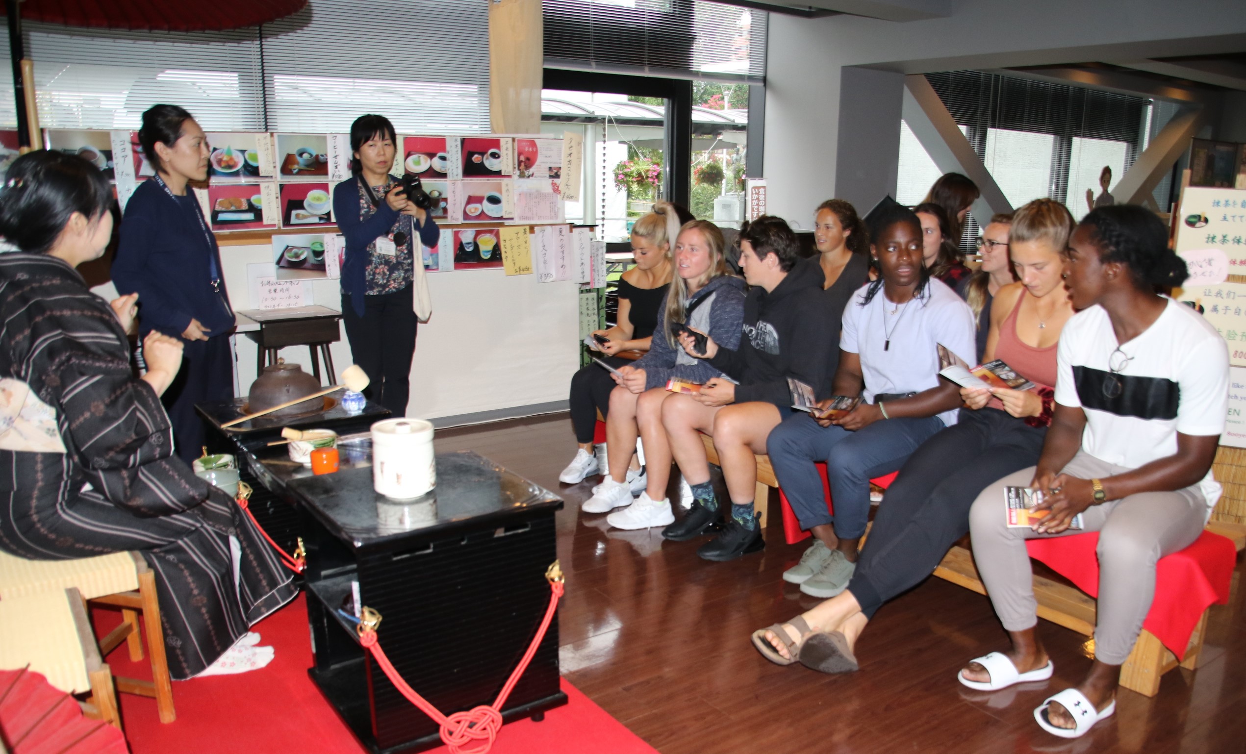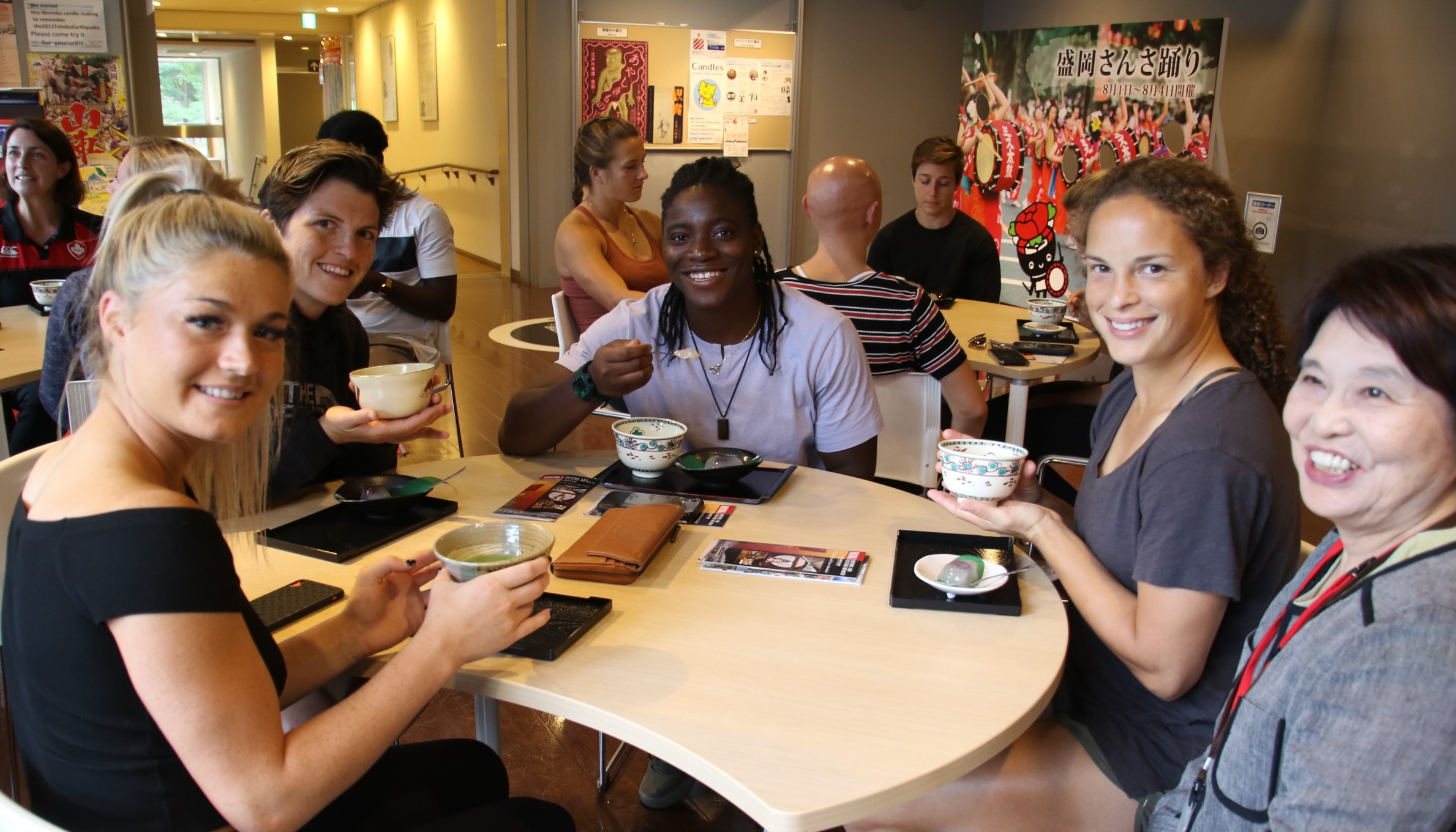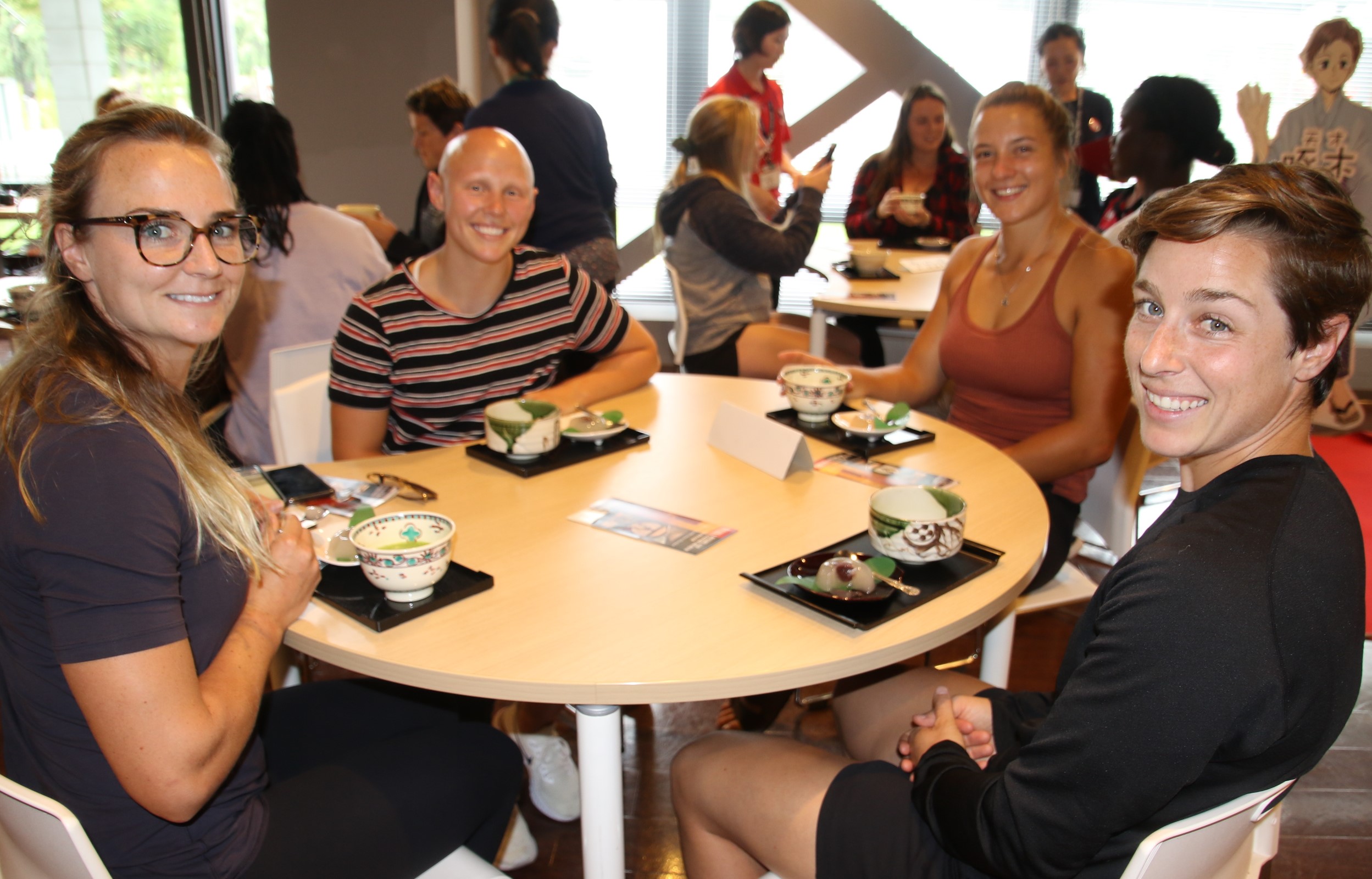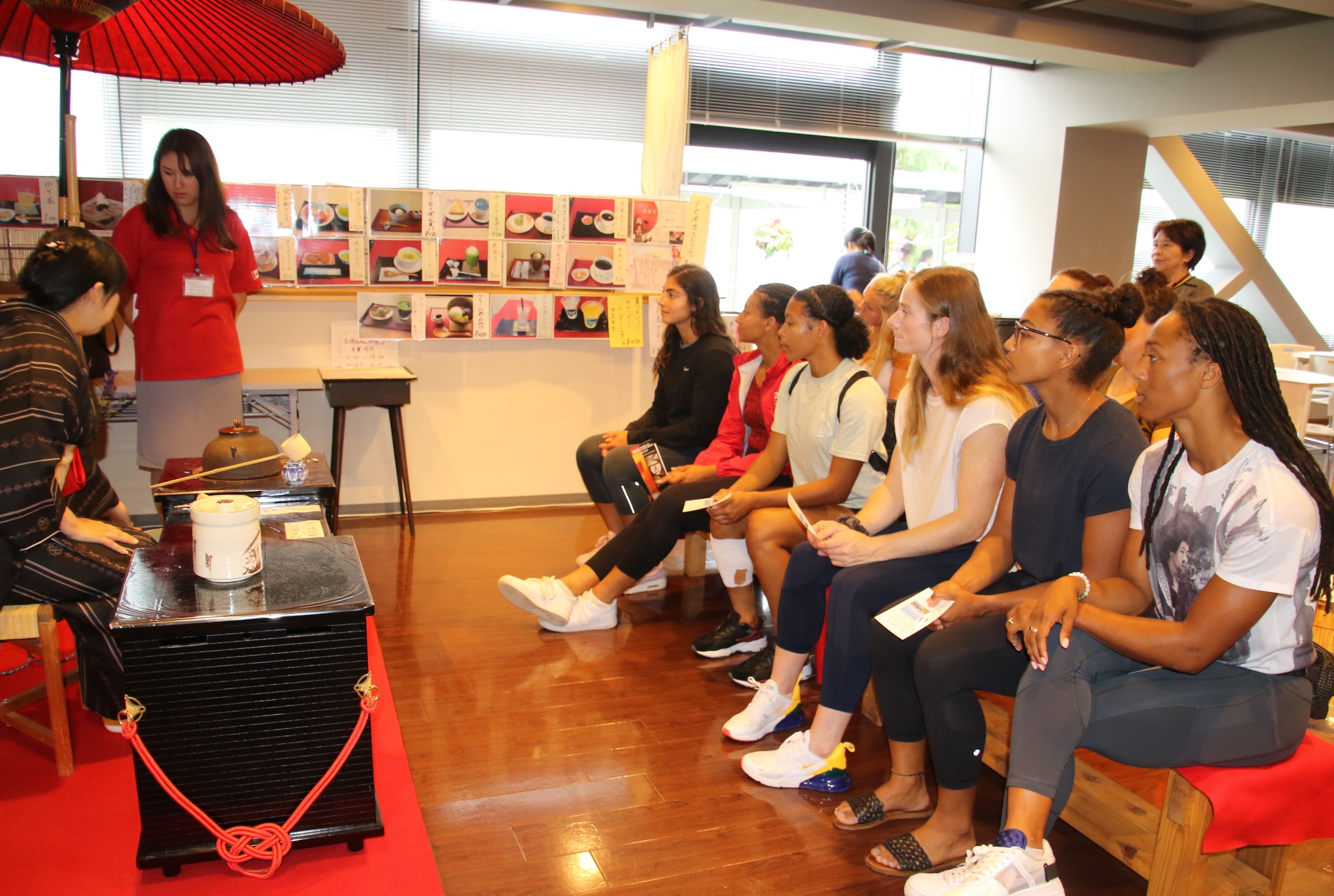 初めて食べる水まんじゅうと程よい苦みの抹茶は、初めて味わう選手も多く、少し不思議な味に戸惑っていた選手もいれば、お茶もお菓子も完食した選手もいました。