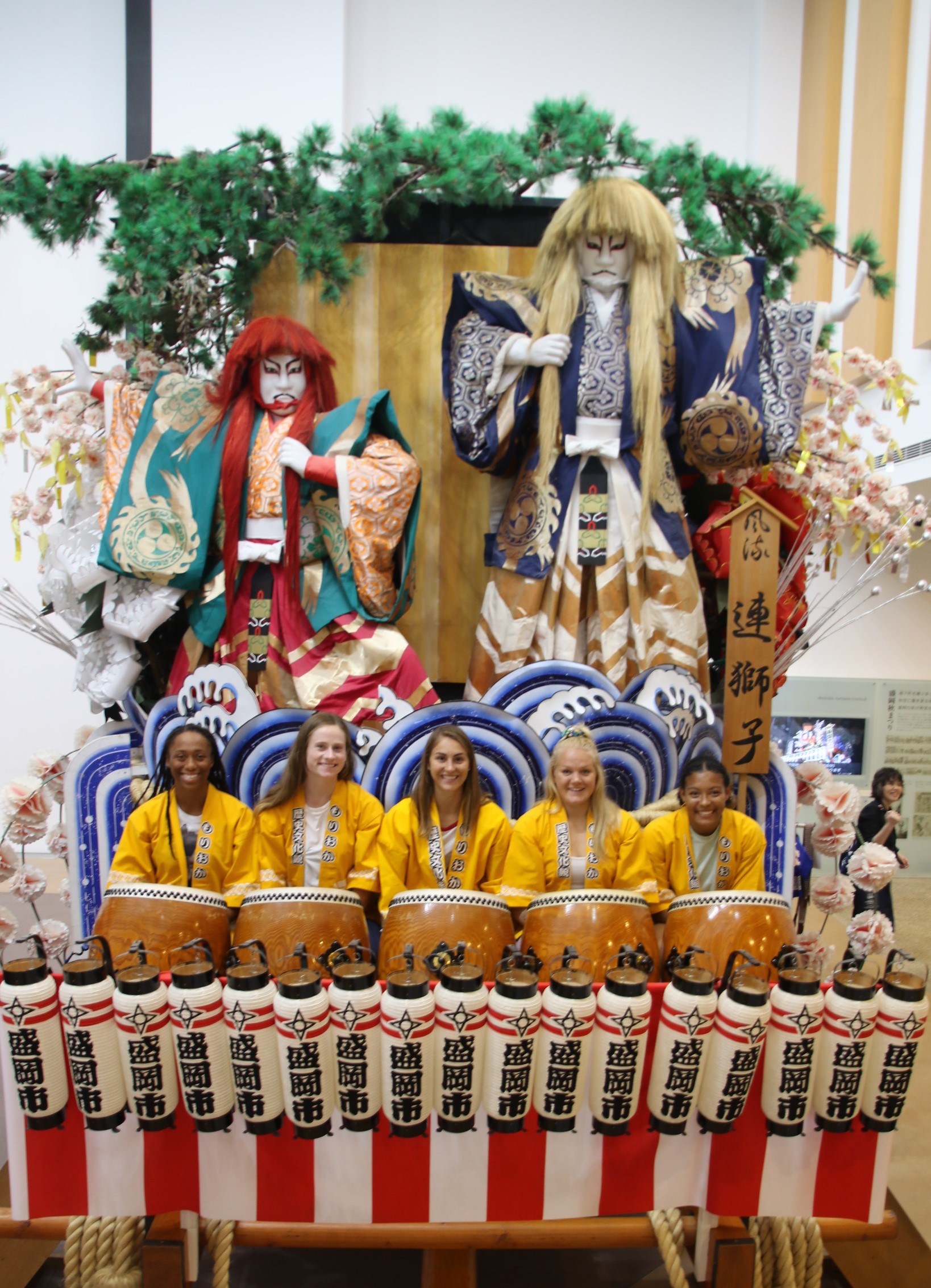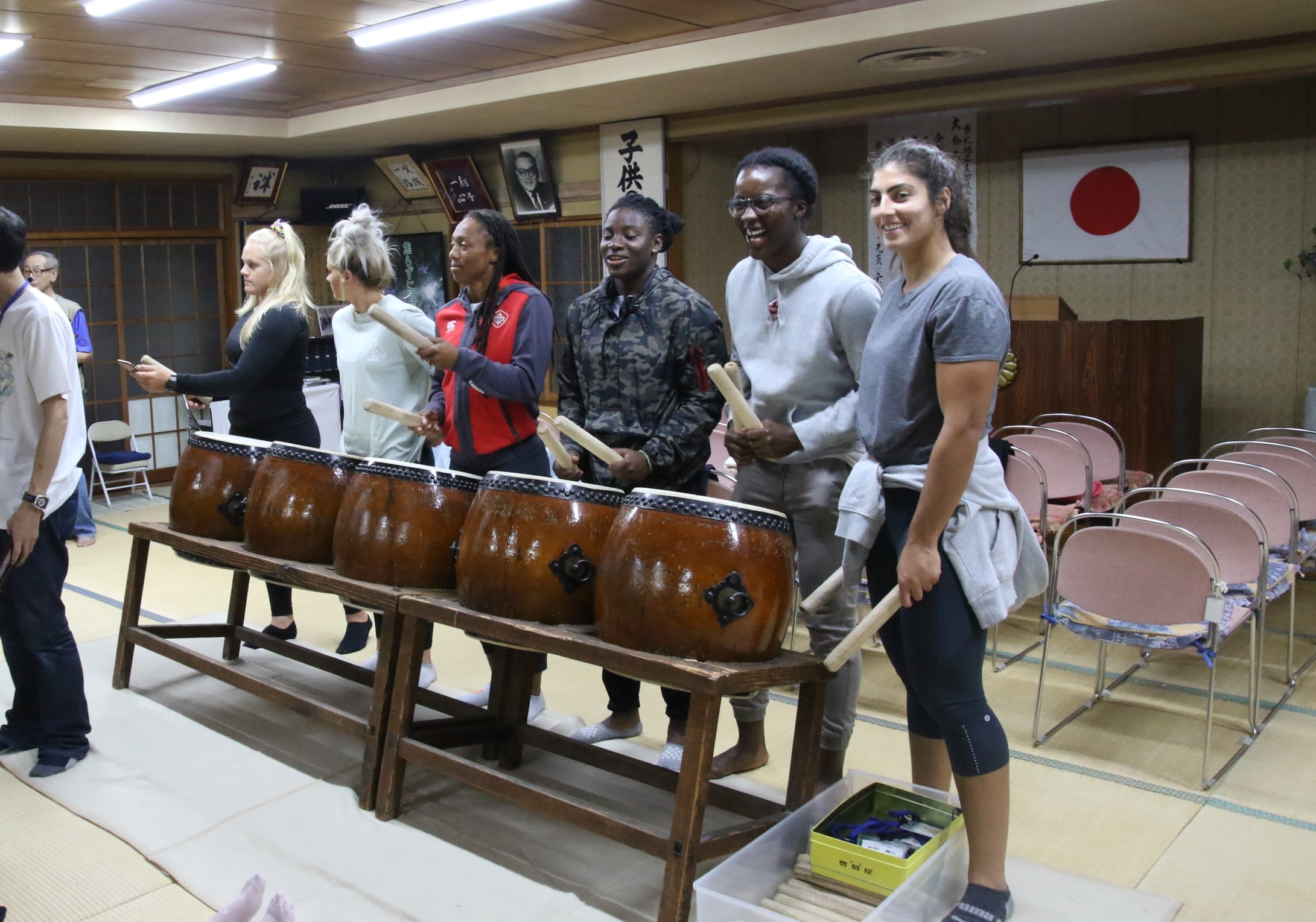 早速太鼓を叩かせてもらう選手たち。お手本を見せてもらいましたが、リズムが単調ではないためとても難しいです。
