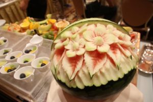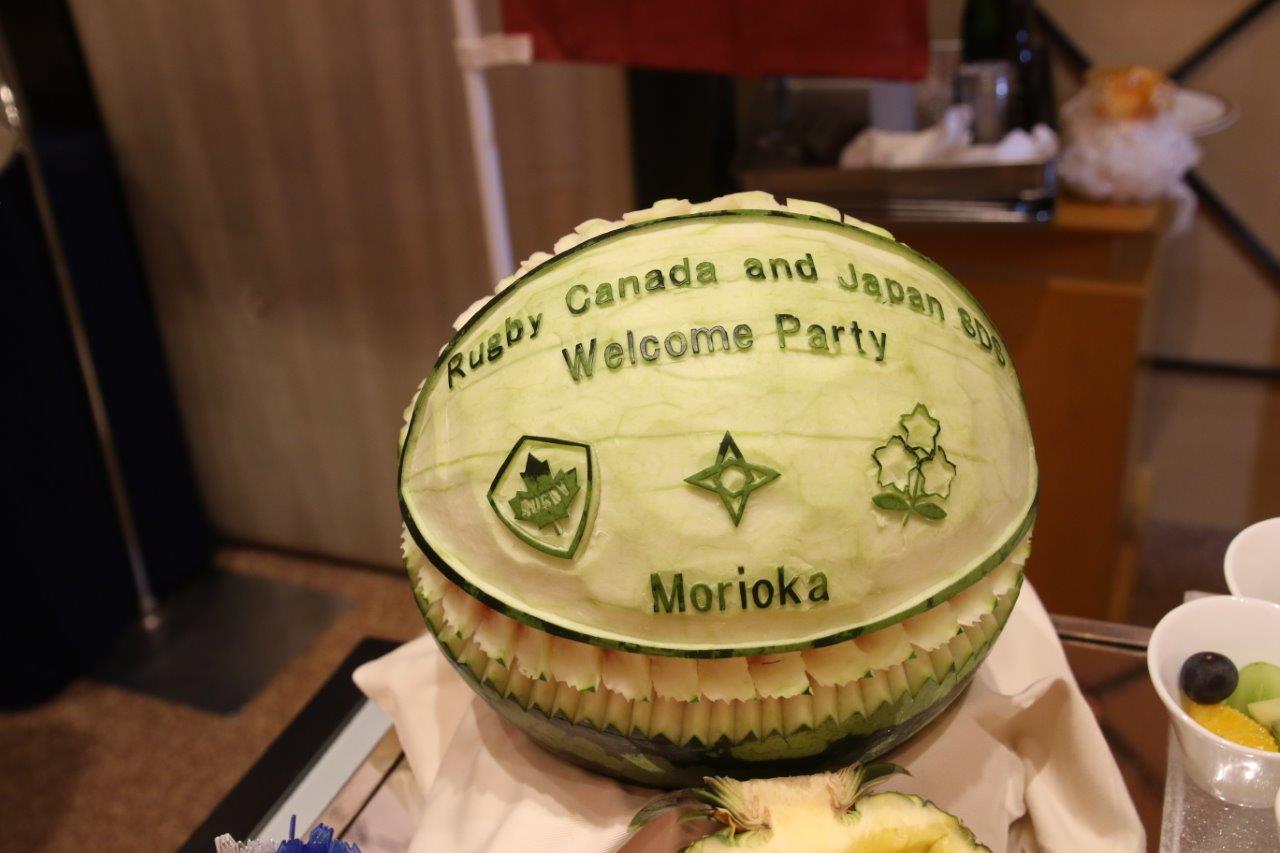 カナダチームと日本チームのロゴが刻まれたスイカです。裏面のお花も綺麗!