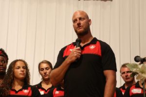 ホストタウンとなる盛岡への感謝の意と、東京オリンピックへ向けた決意を話してくれたジョン・テイト ヘッドコーチ。