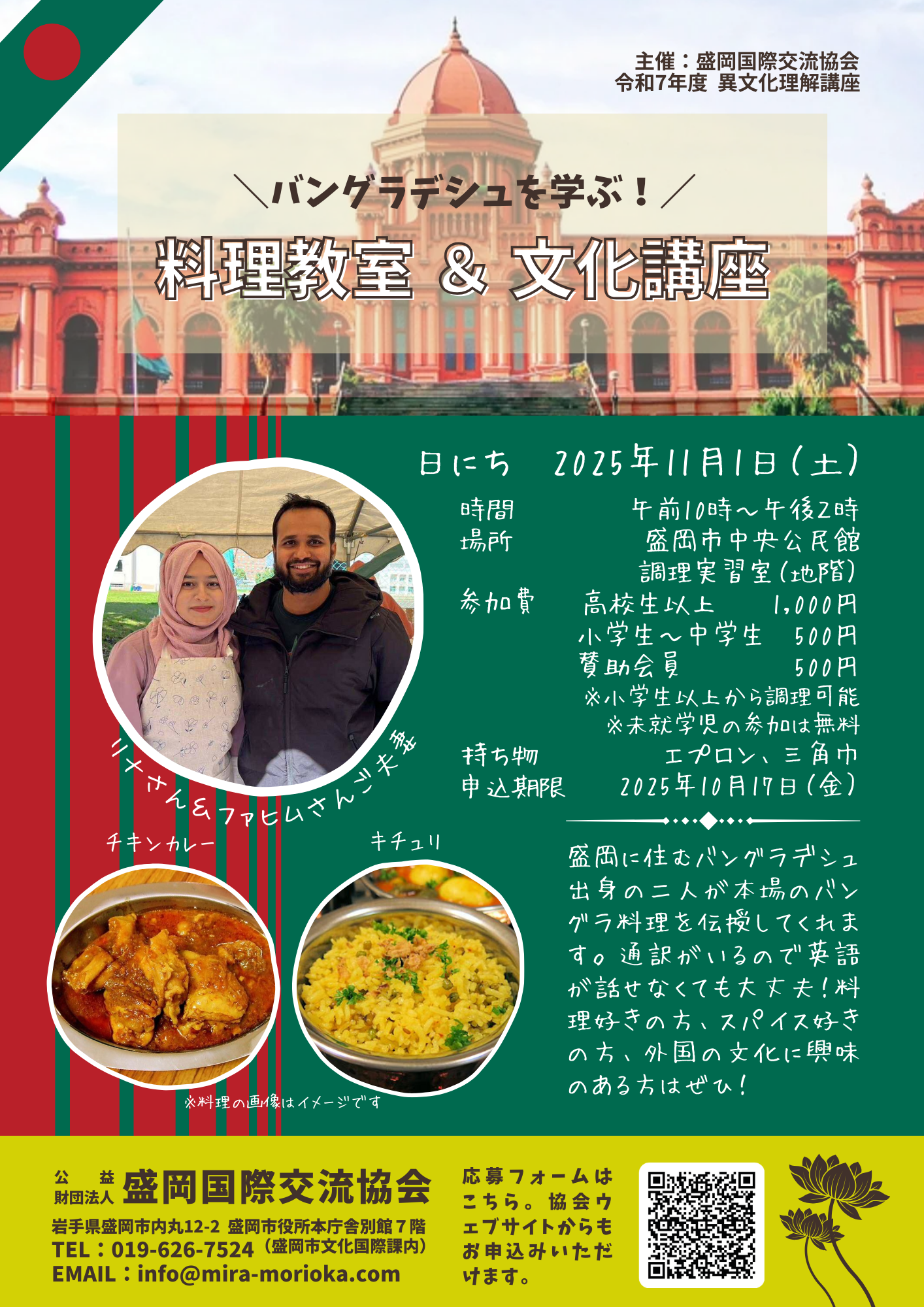 盛岡国際交流協会では、令和7年11月1日(土)に、「バングラデシュを学ぶ!料理教室&文化講座」を開催します。