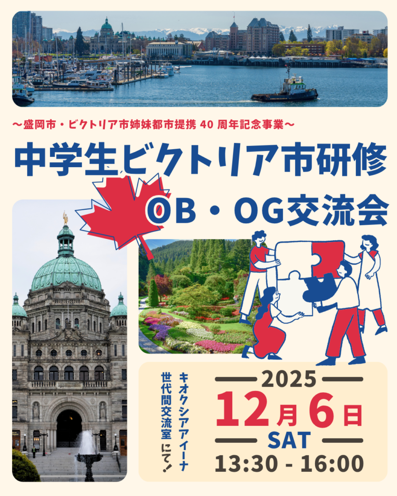 盛岡市とビクトリア市の姉妹都市提携40周年を記念して、「中学生ビクトリア市研修OBOG交流会」を開催します!