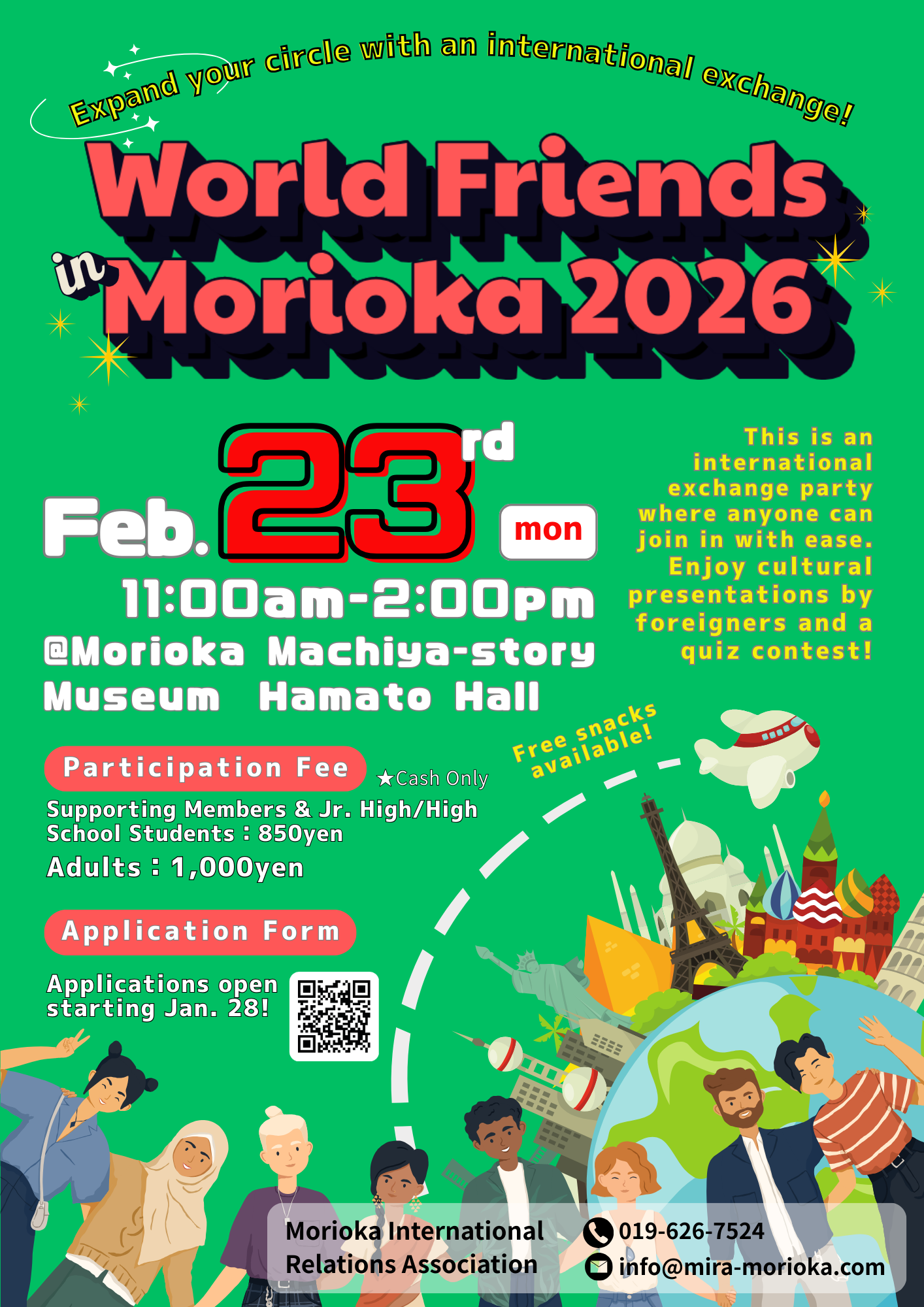 盛岡国際交流協会 担当:板垣、アードマン Morioka International Relations Association (In Charge: Erdman, Itagaki) ✉:info@mira-morioka.com ☎:019-626-7524 |